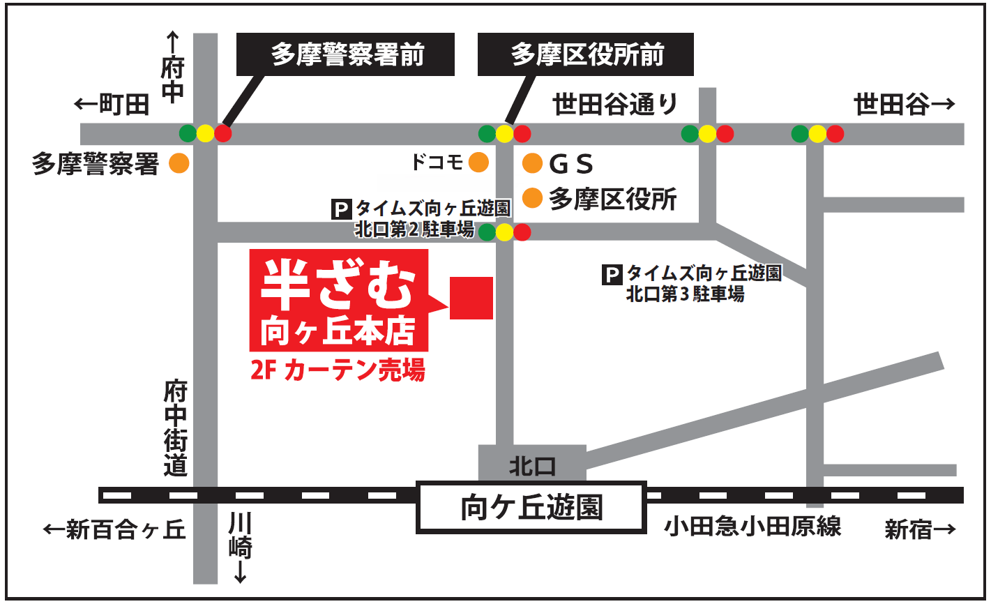 小田急線 向ヶ丘遊園北口 徒歩約3分程 向ヶ丘区役所通り直進すると左手に店舗があります。